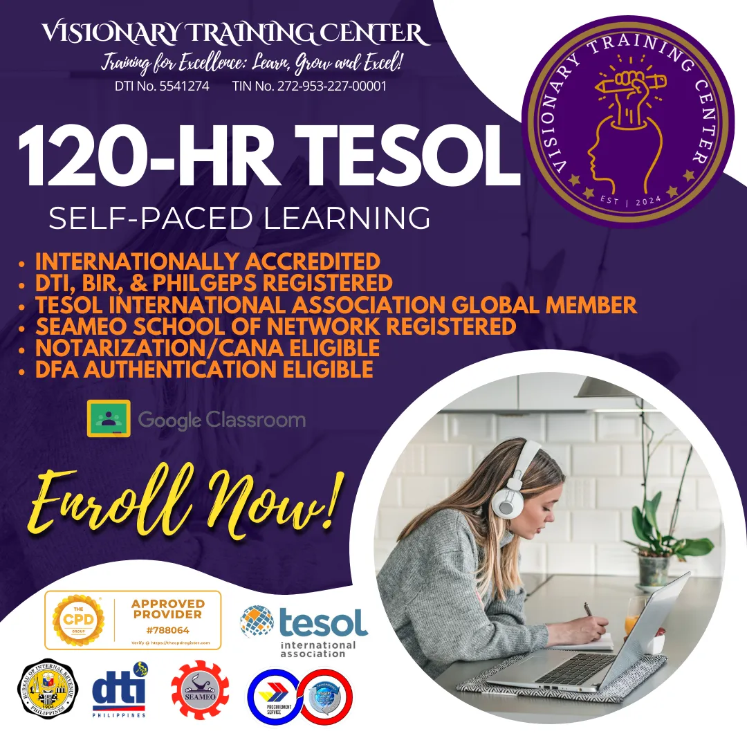 Visionary Training Center proudly holds accreditation from The CPD Group in London, UK, with accreditation number #788064, affirming our commitment to providing high-quality continuing professional development. Additionally, we are an accredited member of the TESOL International Association, bearing ID no. 364462, ensuring our TESOL and TEFL courses meet international standards and are globally recognized. We are also part of the SEAMEO Schools' Network. Our registration with the Bureau of Internal Revenue (BIR), Department of Trade and Industry (DTI), and Philippine Government Electronic Procurement System (PhilGEPS) in the Philippines allows us to issue Official Receipts, further legitimizing our operations. Moreover, our certificates of completion are eligible for CANA and Apostille certification, making them valuable credentials for teaching opportunities worldwide.
